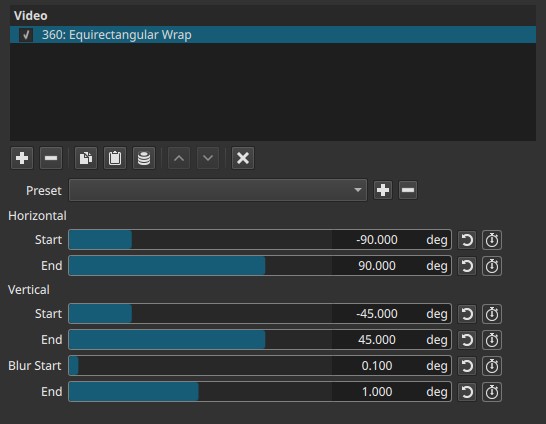 This is a 360°-specific utility filter. All parameters operate in angular coordinates (degrees), not pixels.