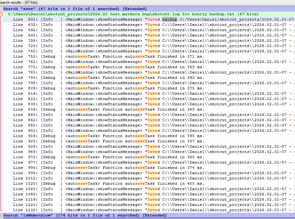 17:34 → no other backup was created, saved 14 times since opening (from filtering for “save” in application log), including right now