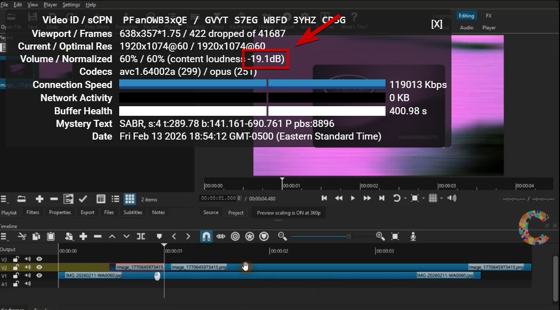 If you right-click your video and enable the Stats for nerds overlay, you’ll see that the content loudness is at -19.1dB.