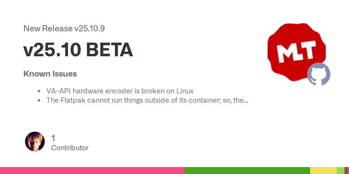 While testing some things while preparing this, I noticed that VA-API hardware encoder on Linux is not working. Also, the Flatpak cannot run things outside of its container; so, the HTML generator, Text to Speech, and Open With features will not work. The Flatpak release build will have those features removed.