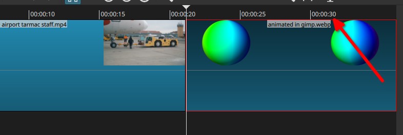 Then you make the transition, by moving the one on the right side to the left side… thus also reducing its length on the timeline (look now the time on the timeline >> no more 30 seconds: