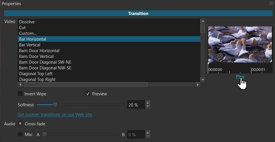 The embedded viewer provides a quick preview of the wipe without having to play it in the main player. It starts automatically when you choose a wipe. You can also seek and scrub the mini player. After the preview has played once click Play to play it again.