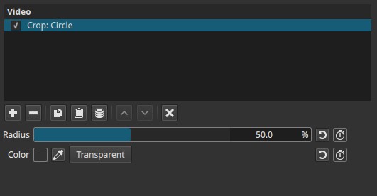 Applies a circular crop mask to the clip, keeping a circular region visible while replacing everything outside the circle with either a solid color or transparency.