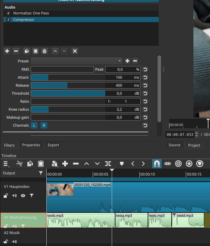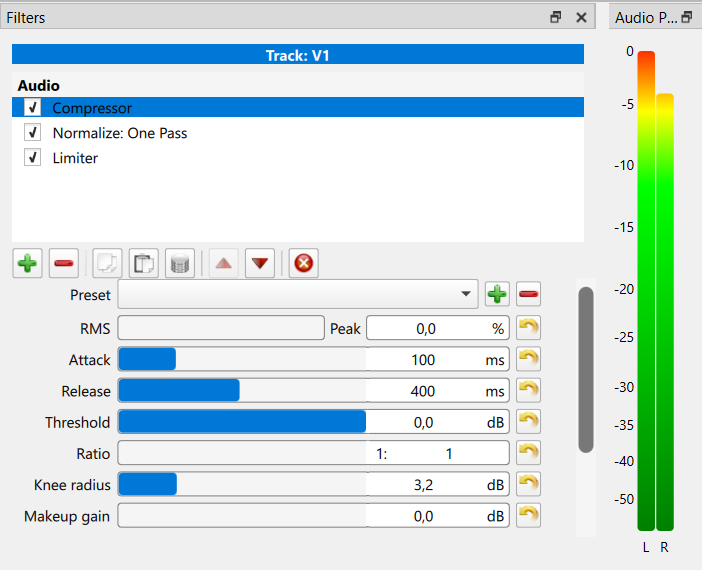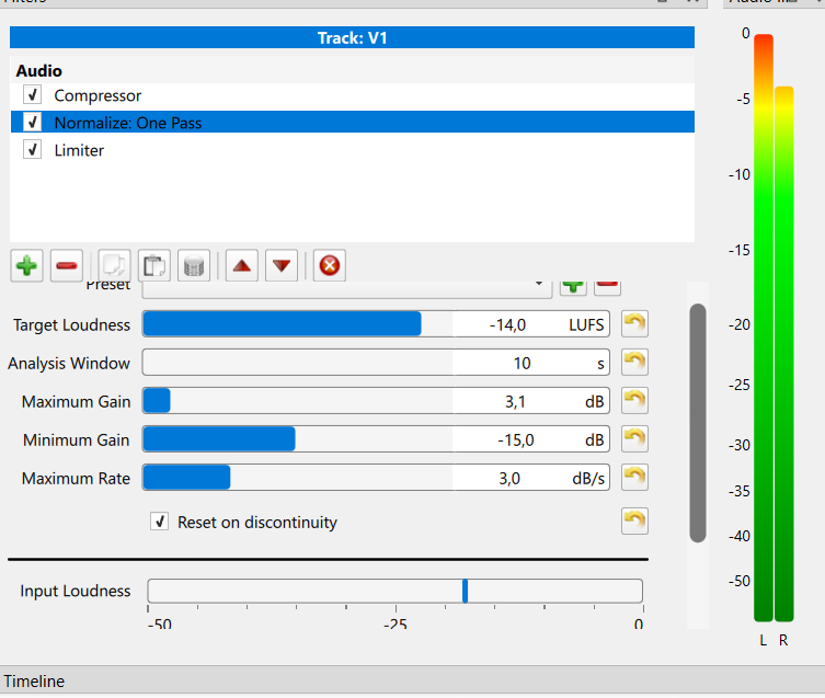 I just wonder how a professionel video editor does this job. At the moment I add the two pass normalization filter for every single audio clip in the time line. That takes lot of time. And in the end I need to double check that I really added it too all clips. And check if the level -15 is correct. (I will save -15 as my own set)
