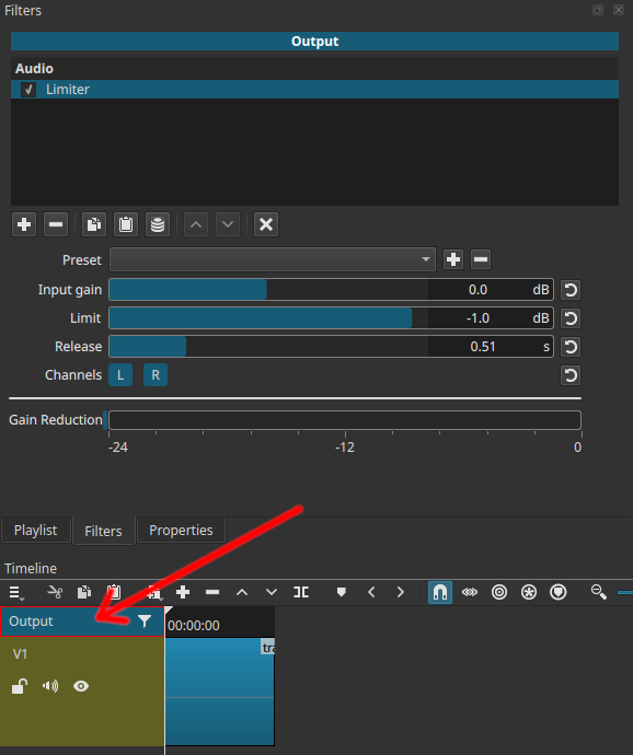 There is another track head called Output (see arrow in screenshot). After all the individual tracks are mixed together, the Output filters are applied to that mixdown. This is where we want the limiter, so that it is applied at the very last stage. A limiter on an individual track cannot protect the entire mix from clipping because the music on another track could push the combined level over 0 dB. That’s why the limiter is on the Output… it sees the final mixed audio and can clamp any problems before the encoder receives it.