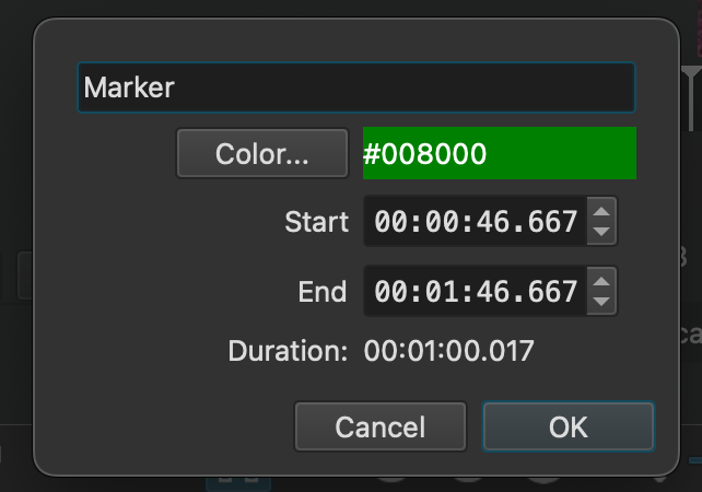 I have a marker range, and mousing over (first screenshot), it’s showing what I believe is the correct duration of 1 minute, here. In the marker editing dialog window (second screenshot), the start and end times are correct, but the duration calculated is different. I’m guessing this one is incorrect and off by an added frame (60 FPS project).