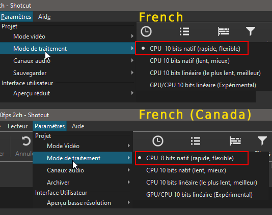 POUR la version Française j’ai coché 10 bit natif et enregistré le même projet en 5 minutes au lieu de 15 et Shotcut la enregistre comme un 8 bit natif.