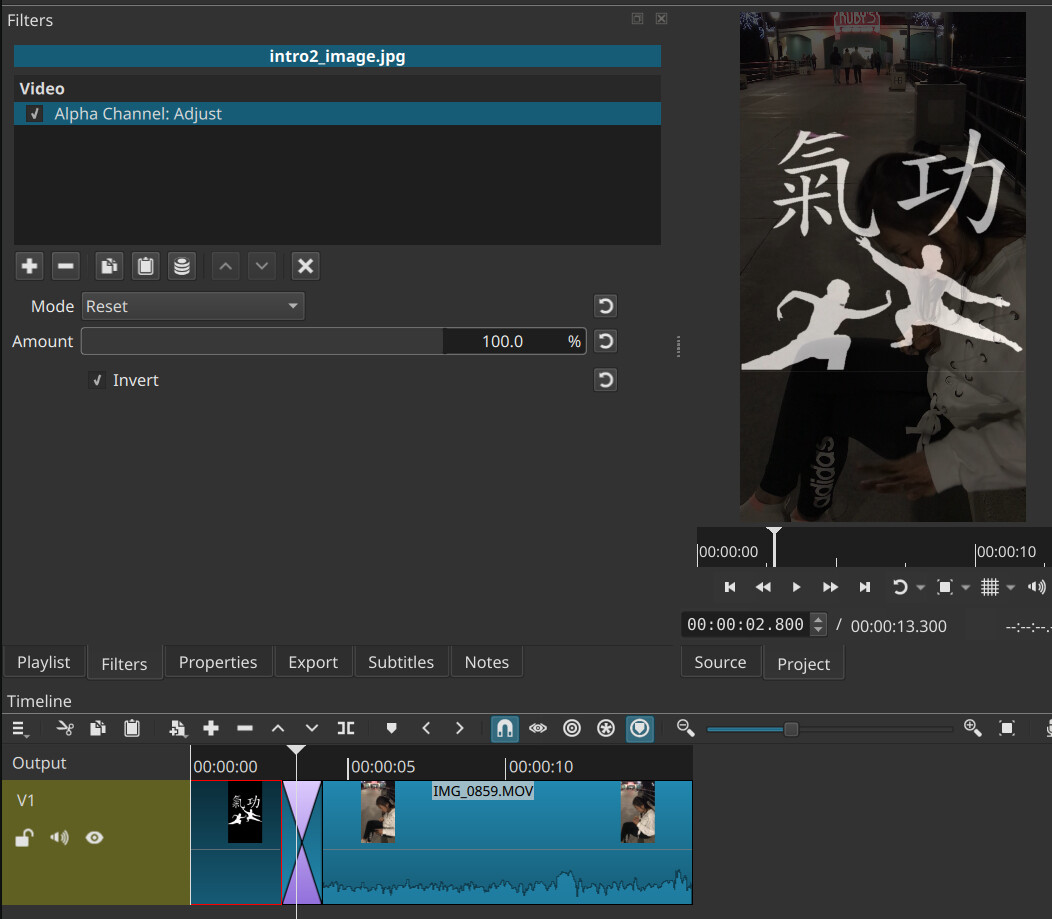 The problem occurs because the intro2_image.jpg aspect ratio does not match the project exactly. Shotcut pads images with transparent black. During the transition the black background of the image does not blend with the video where the borders are transparent. You need to force the entire image to opaque. To do that add the video filter Alpha Channel: Adjust to the image. In the filter change Mode to Reset; that makes the entire image transparent. Click the Invert checkbox; that makes the entire image opaque.