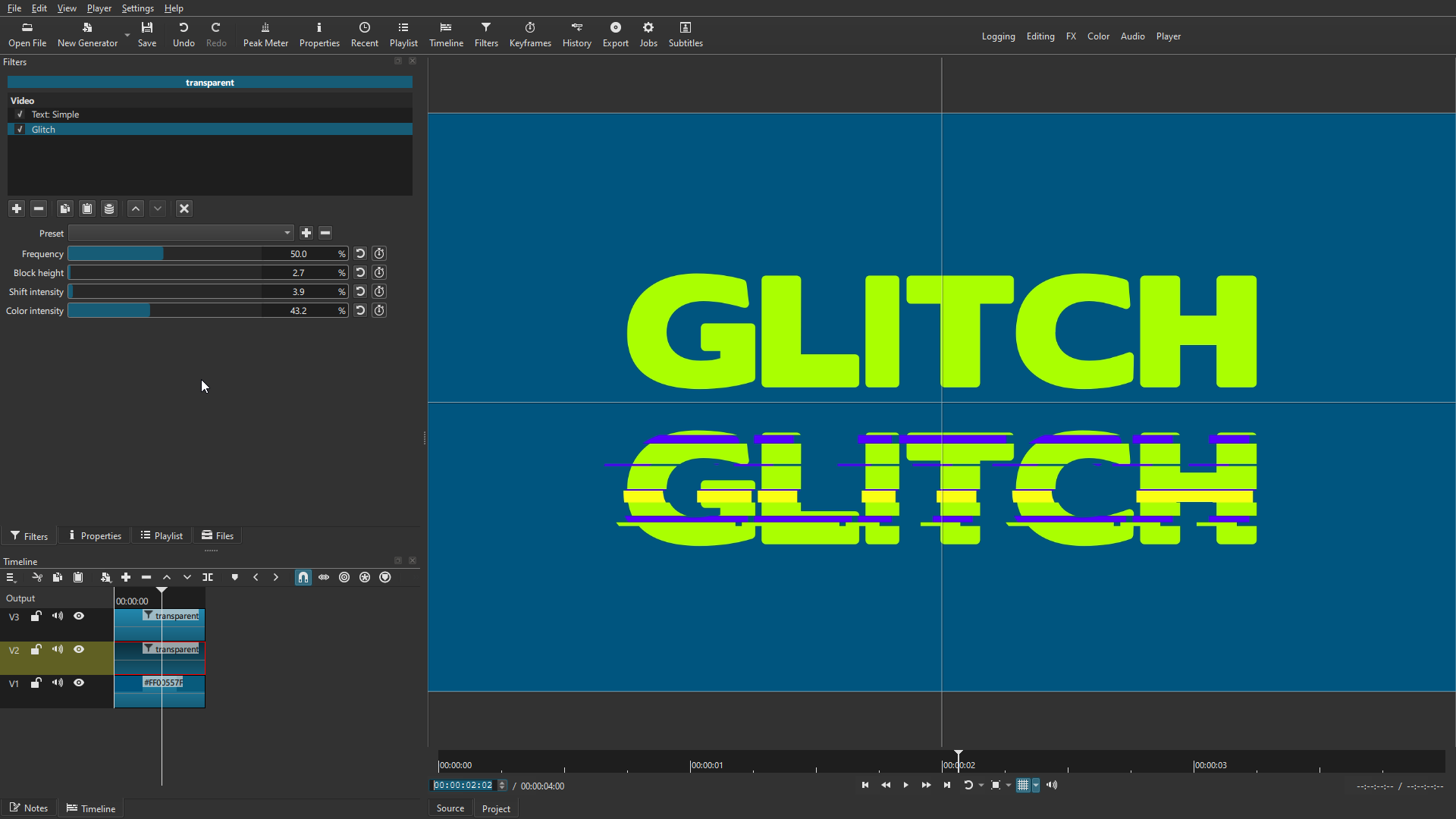 The Glitch video filter introduces randomized digital distortion to simulate, for example, corrupted video signals or transmission errors. The effect works by displacing horizontal bands of the image and altering color channels during short glitch events. It is useful for stylized transitions, motion graphics, or adding visual noise to footage.