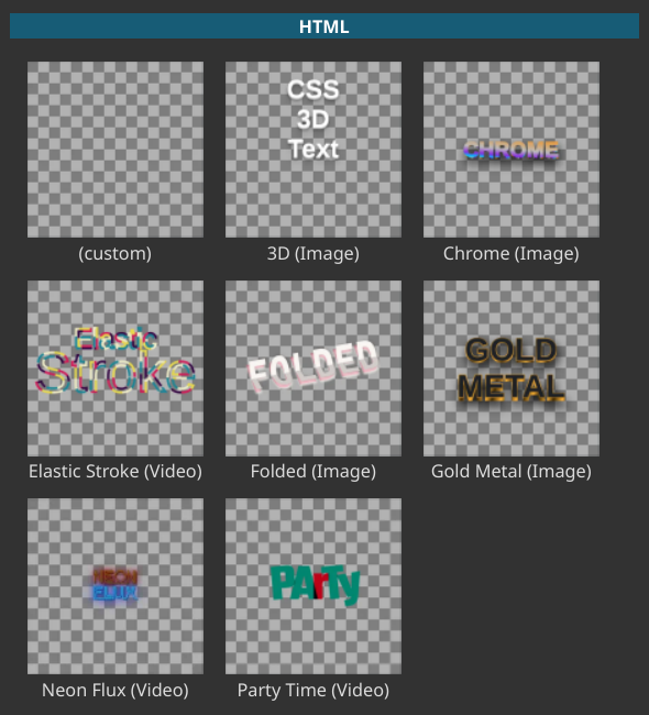 Choosing Image/Video from HTML from the menu File > New or a toolbar New Generator button shows presets/templates in Properties: