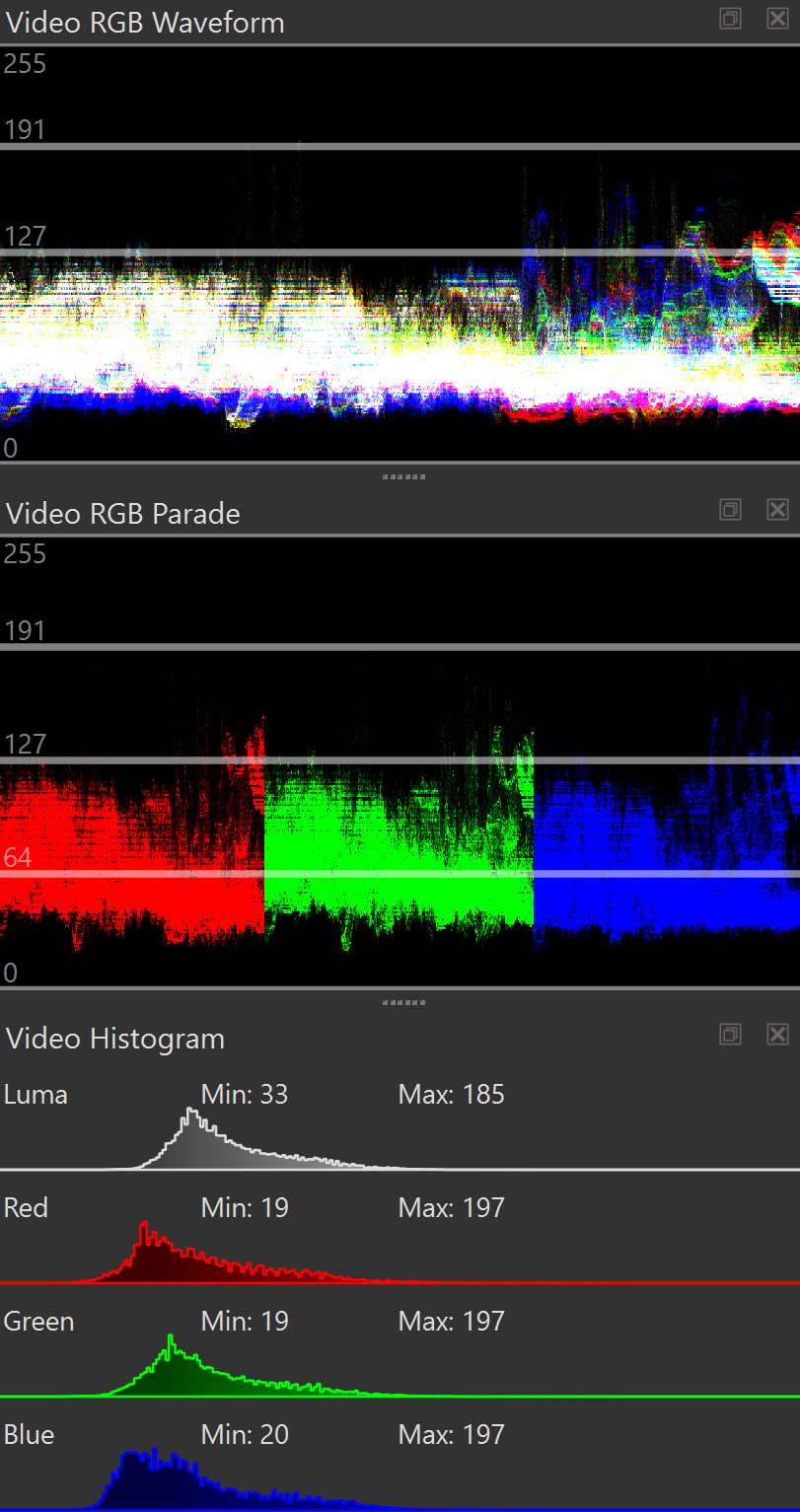 Here are video scopes for a clip LUT converted into 709 SDR: