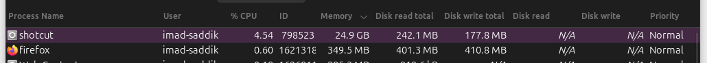 Now, I added 16GB of RAM to my laptop. Today, I was working on a 60 minutes video. I was not doing a lot of editing, I was just cleaning the video. I was surprised to see that Shotcut is consuming 25GB of RAM.