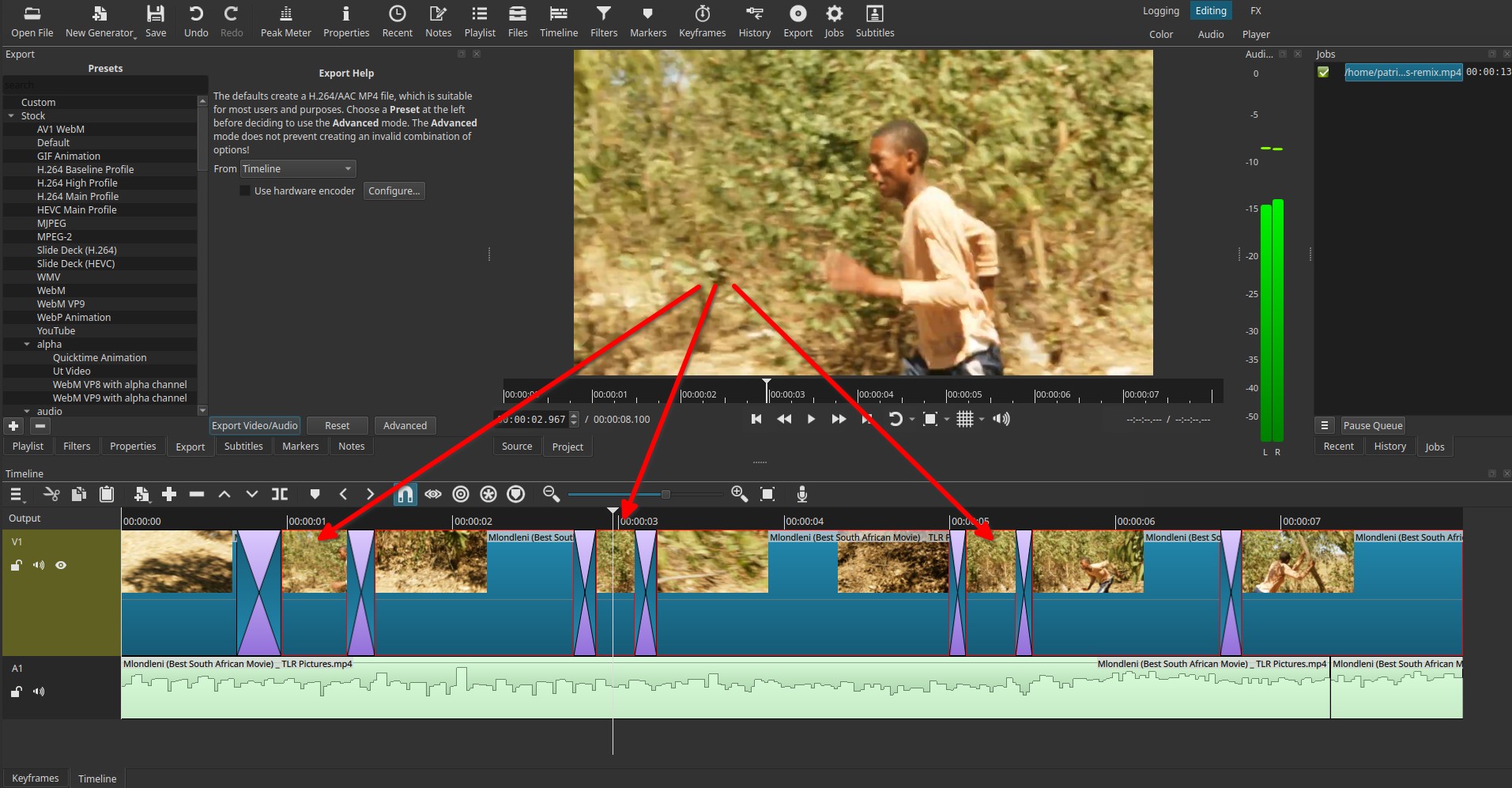 If I may, I would increase the speed of the clips while the guy is running (in properties), make them shorter or duplicate them multiple time if you cannot re-shoot that scene and overlap them with the shaking forest more often.