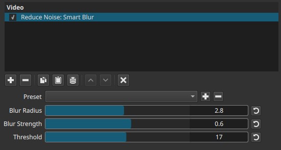 The Smart Blur filter reduces noise by applying a selective blur that attempts to smooth small variations while preserving edges. Unlike simple blur filters, it limits smoothing based on pixel differences to avoid blurring across strong edges.