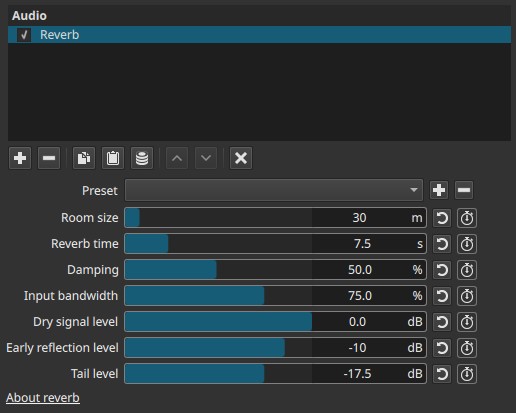Reverb is a time-based spatial effect. All parameters are keyframeable, allowing the perceived space to change over time.