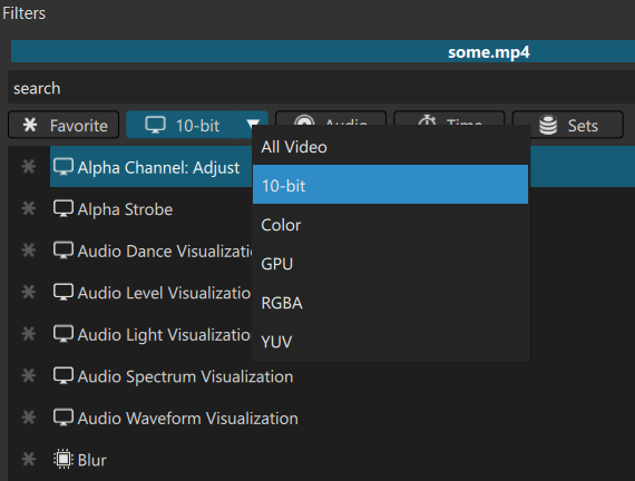 The filters menu Video button shows a drop-down to choose a suitable filter for either 10-bit and/or GPU processing pipelines: