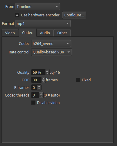 The export profile says libx264. But “Use hardware encoder” is checked which changes the codec to h264_nvenc. The conversion is where bf=0 is getting set. B-frames are sometimes disabled or set to zero with some hardware encoders because the hardware doesn’t support them or has problems.