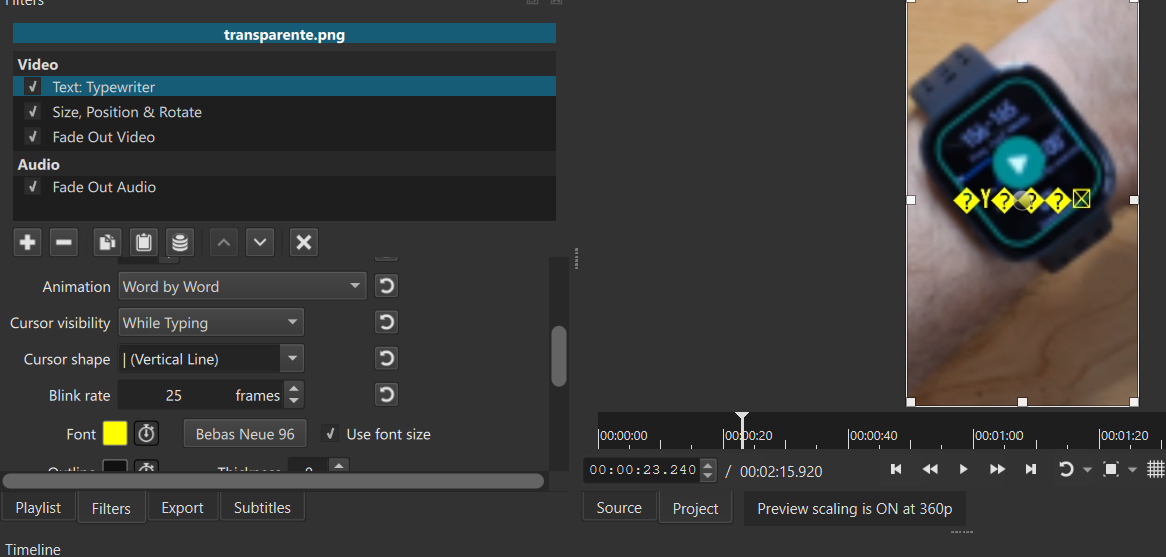 The text:typewriter filter sometimes adds strange characters, and I need to restart Shotcut to get it back to normal.