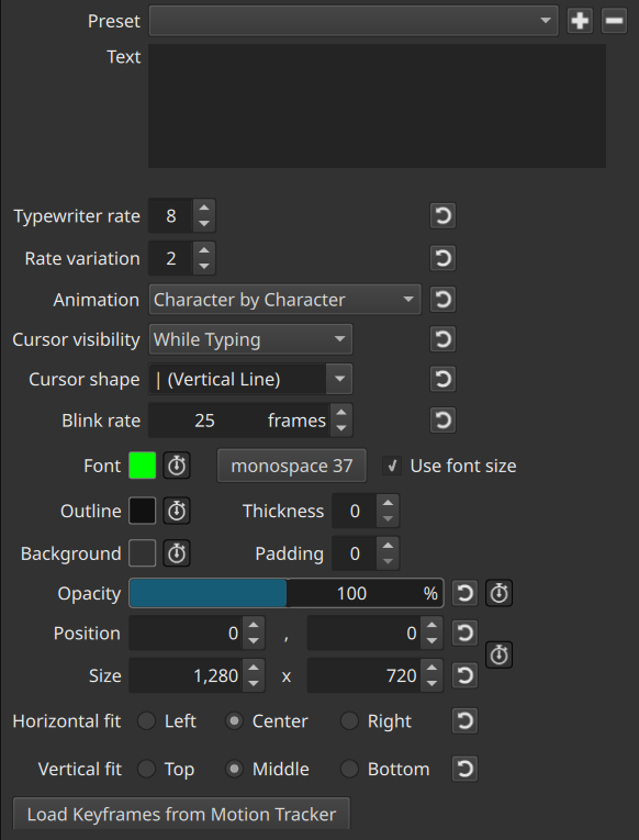All of the parameters on the bottom half are the same as Text: Simple Video Filter . So, this topic explains mainly the typewriter parameters on the top half: