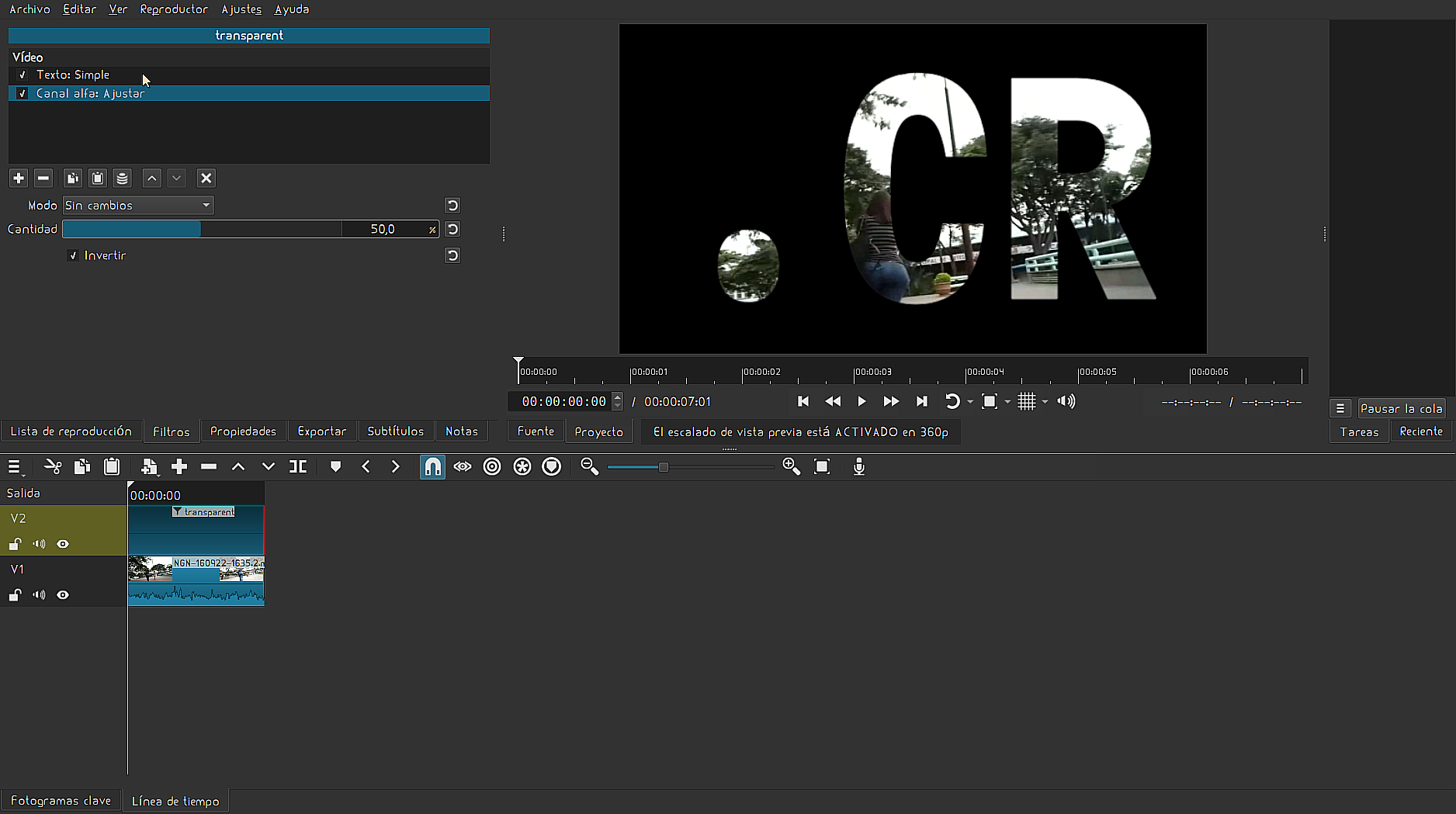 En Shotcut el texto es tratado como un filtro; así que técnicamente no podemos aplicar el canal alfa ni los modos de fusión sobre un filtro.