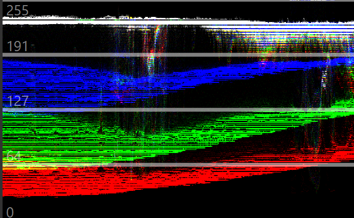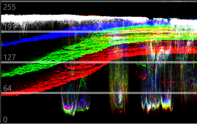 The same LUT added as a clip property, track LUT off ‒ very different waveform, noticeable banding: