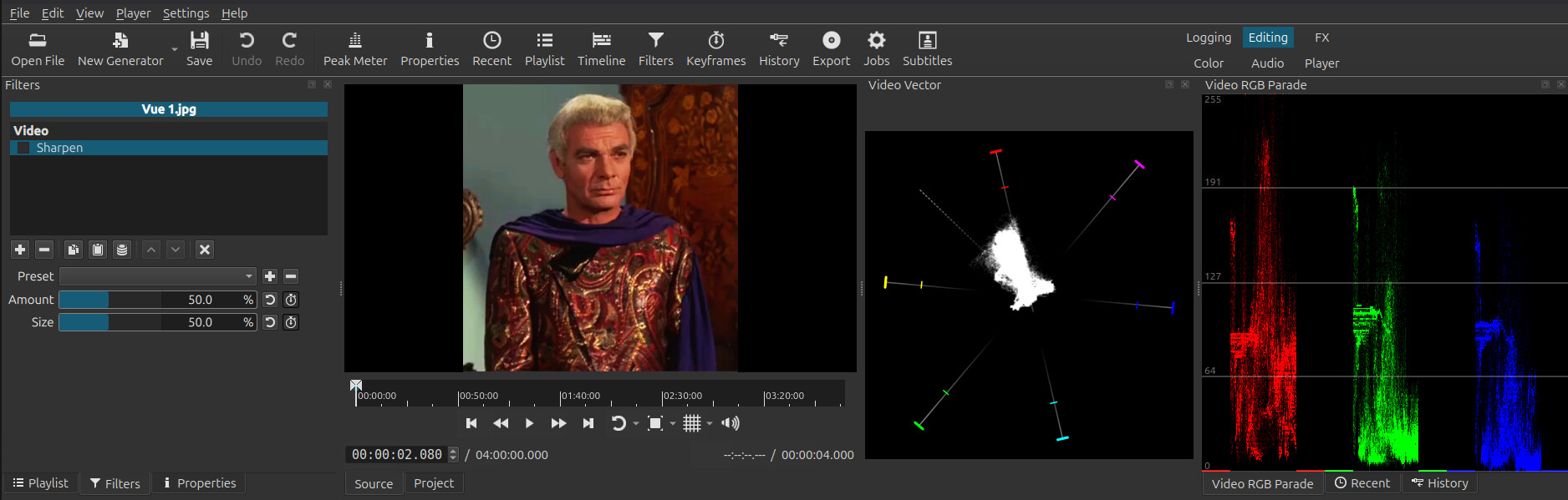 Added a Sharpening filter only; no color change with this test. Everything looks normal this time. I can no longer reproduce this problem. It’s possible I used the same MLT file multiple times for several other videos, renaming the MLT file each time. Is that where the problem lies? Mathusalem.mlt (10.2 KB)