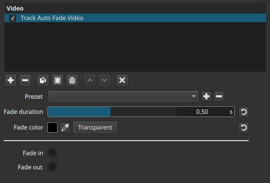 This filter is not keyframeable and applies the same fade behavior uniformly to every clip in the selected track.