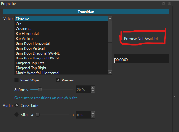 Olá a todos, a opção de ‘Preview’ das Transições não está funcionando em nenhuma das transições, na Timeline as transições estão funcionando corretamente, apenas o Preview que não está disponível.