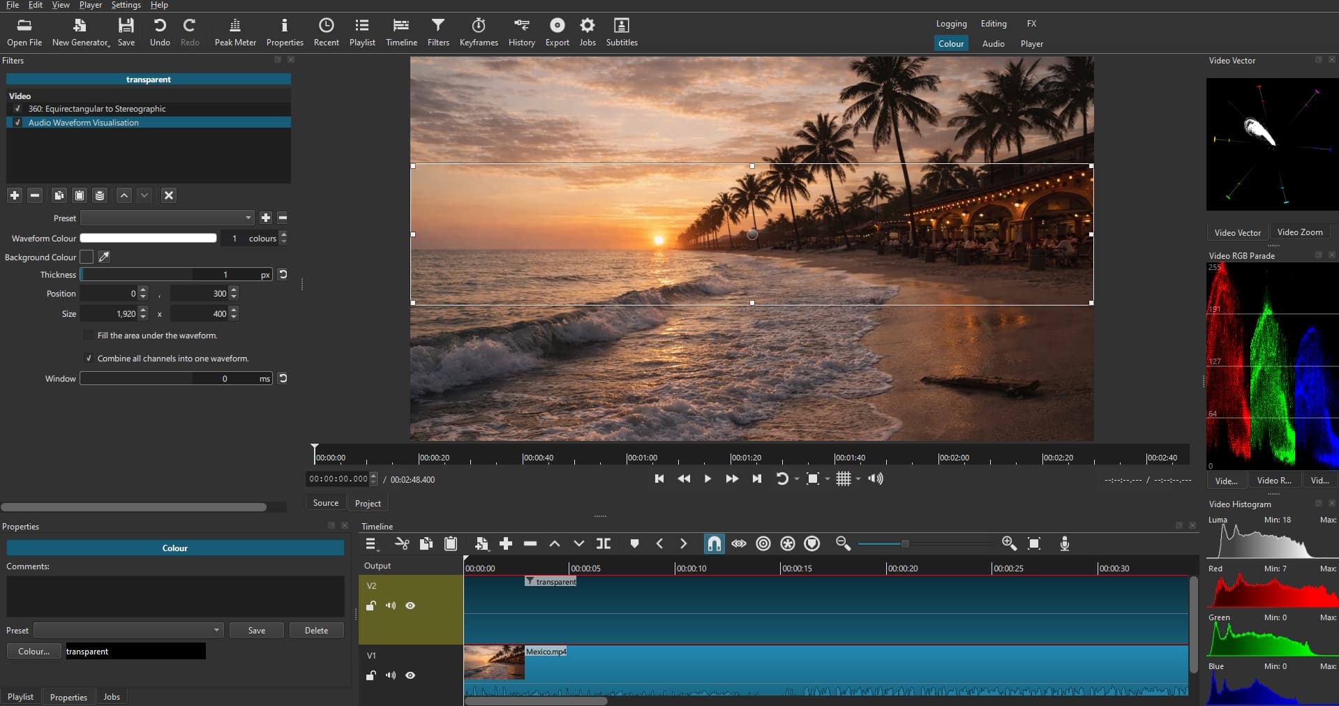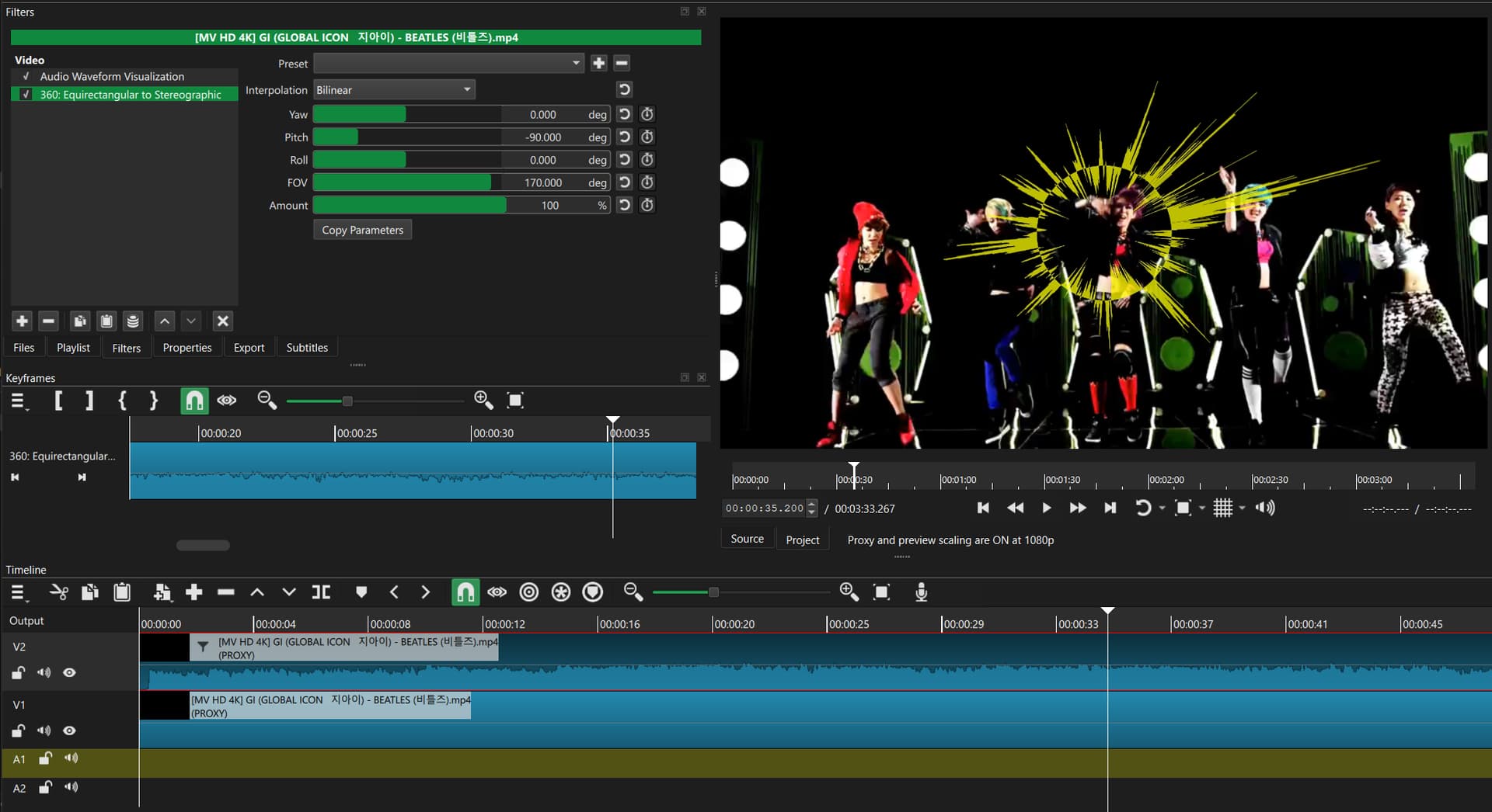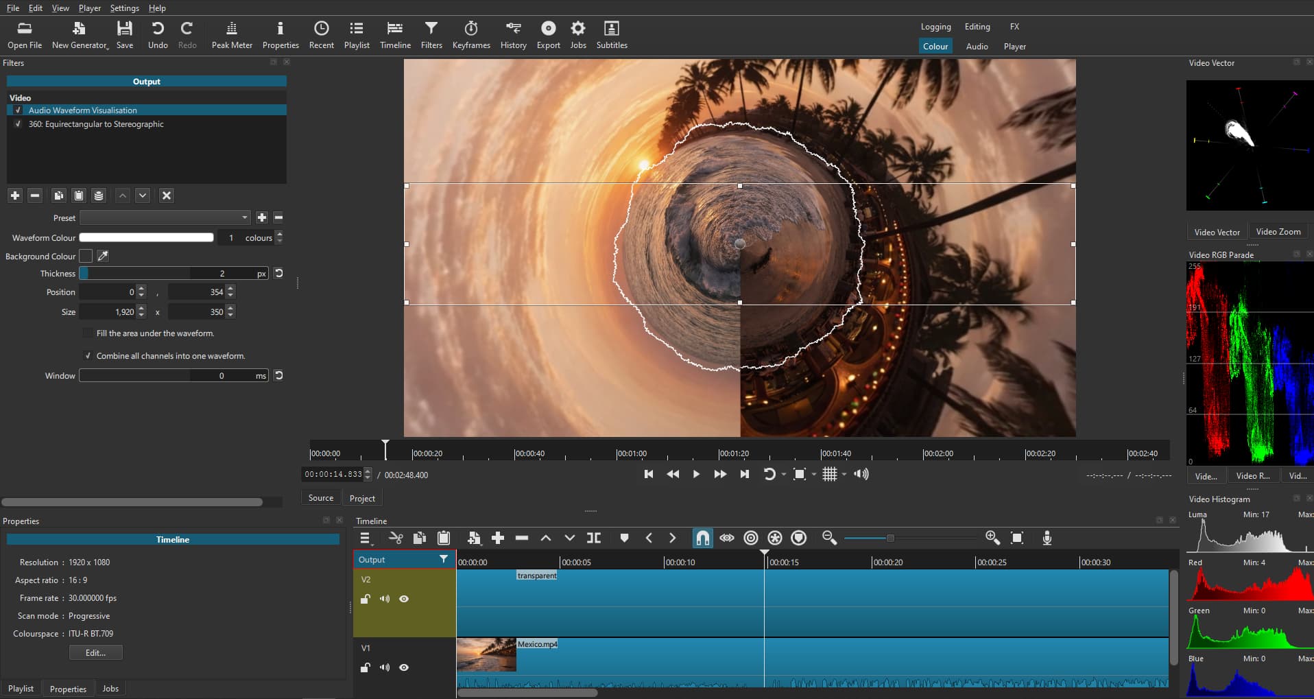 I’m new to Shotcut and need your help. I’m on Win 10 64 Shotcut Ver 25.12.31. The issue: I want to add to my mp4 visualization - circular audio visualizer. The problem is when I put the Audio Waveform Visualization and 360 Equirectangular to Stereographic on V1 where there the video is, my mp4 looks like a globe/ball. mp4 is on V1 and when I add color transparent to V2 and add both the visualizations to V2 to make it circular when play nothing is working. It’s like V1 is not connected to V2. I just want circular audio visualizer on my video without converting the video into some kind of a globe if I apply both visualizations to V1 where video is. Thanks for your help.