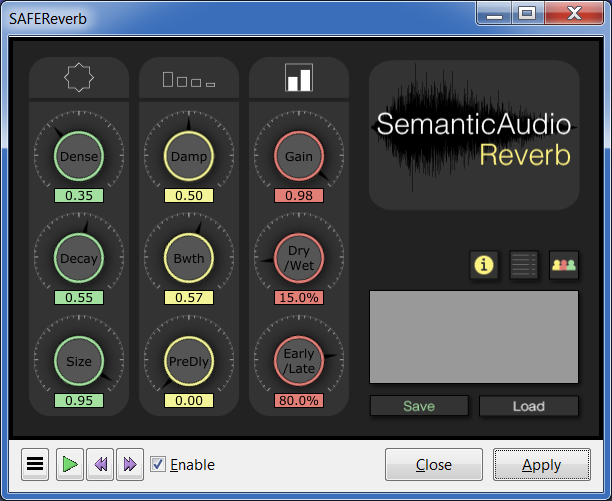 This is a large and mostly empty hall, so the decay time is substantial. Thus, set the Decay knob to some decent amount. As you can see and hear, for this plugin something around 0.5 is good enough.